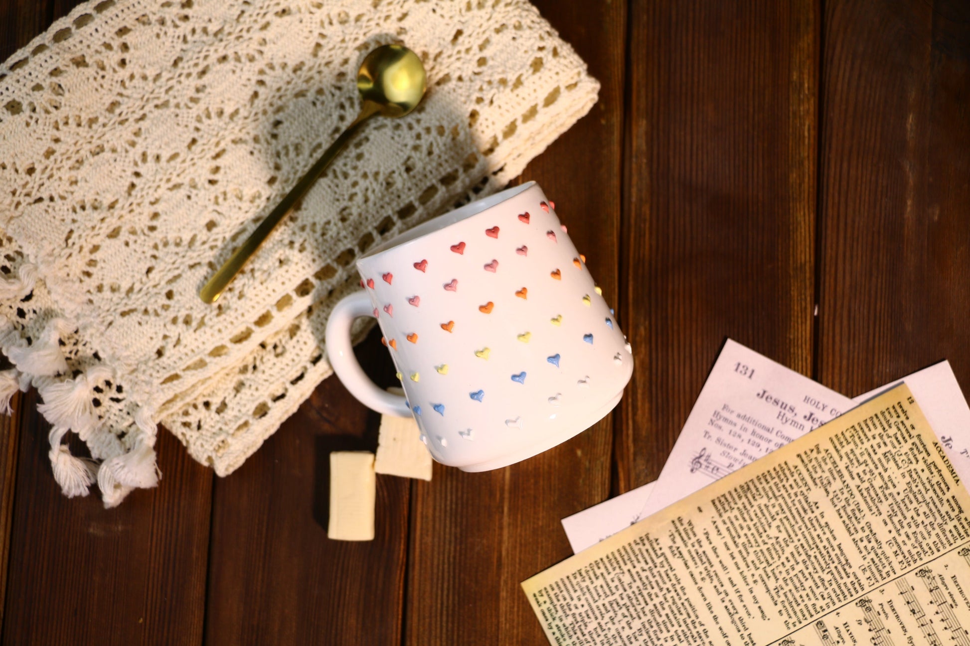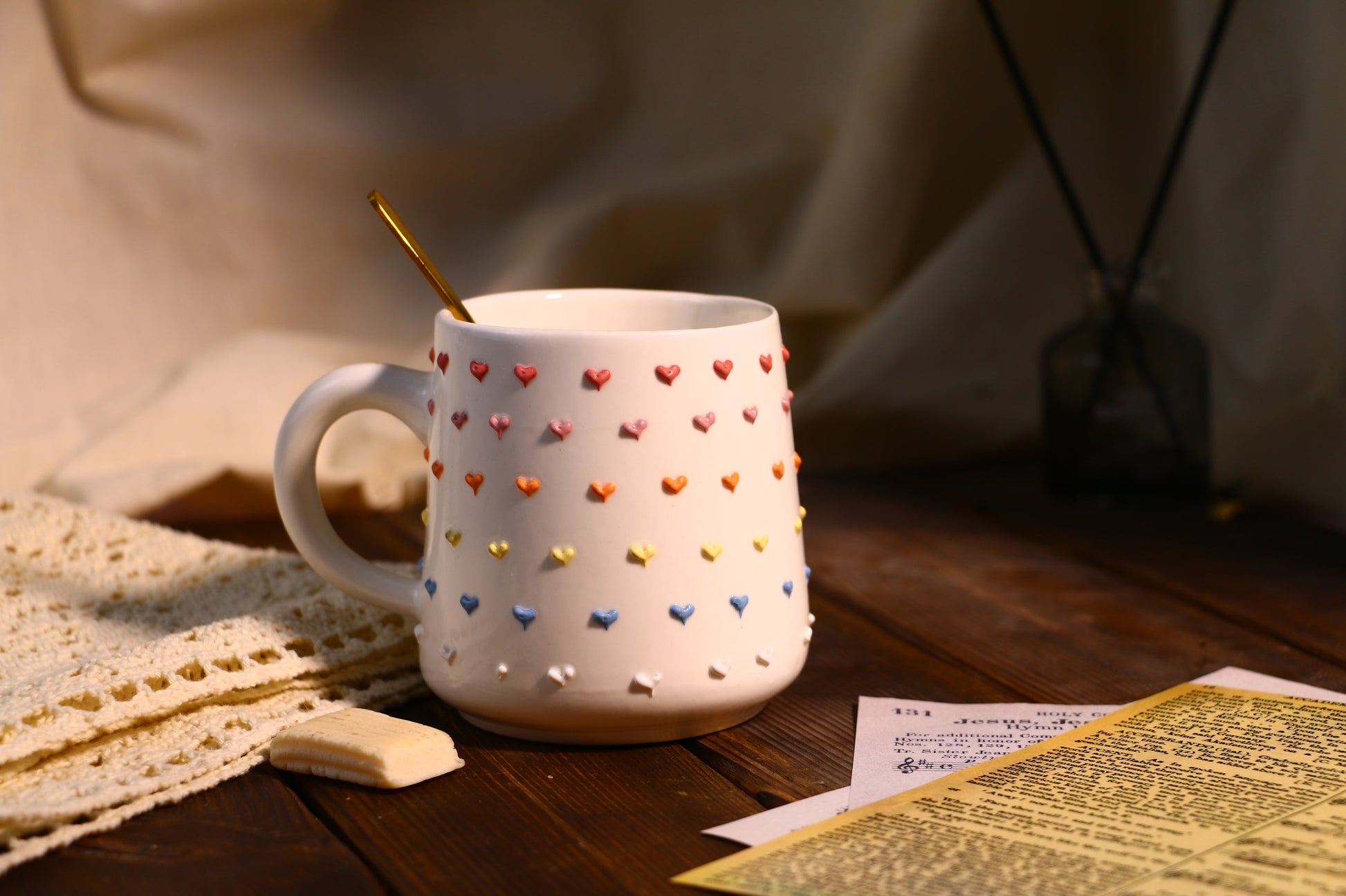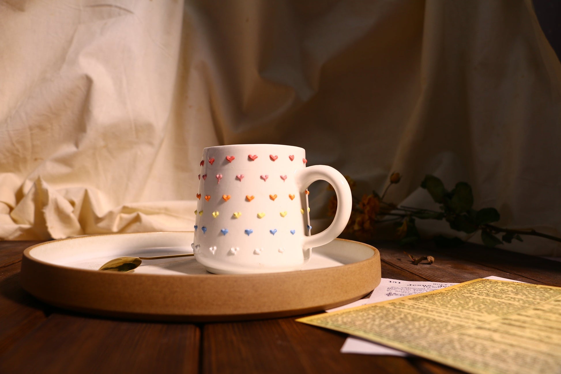 Rainbow Heart Ceramic Coffee Mug, Personalized Handmade Pottery Cup for Gifts