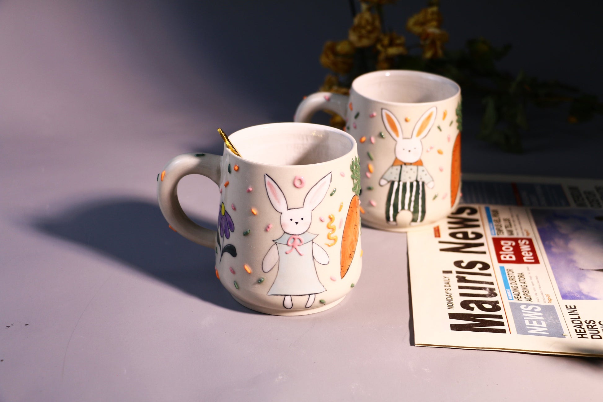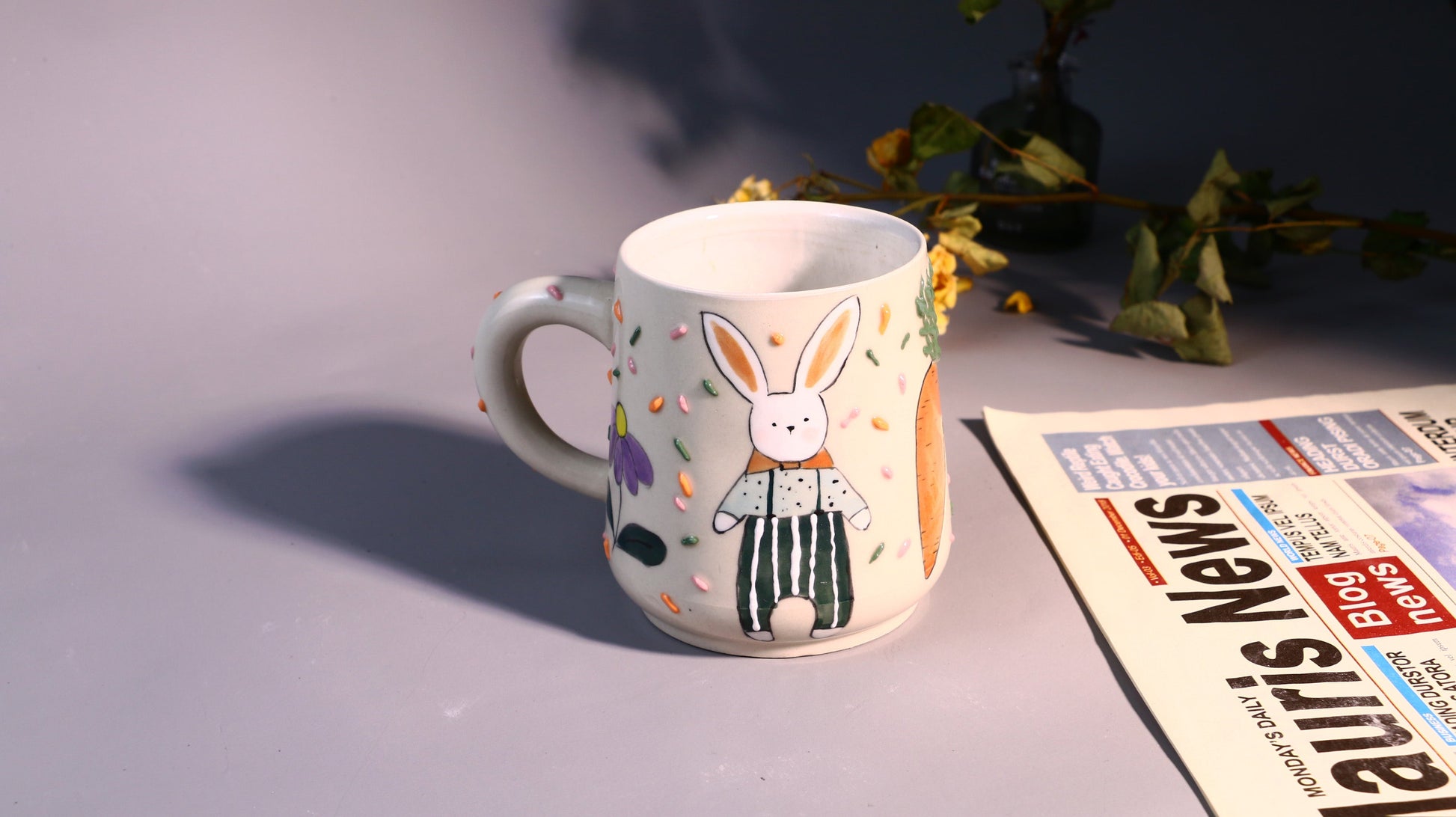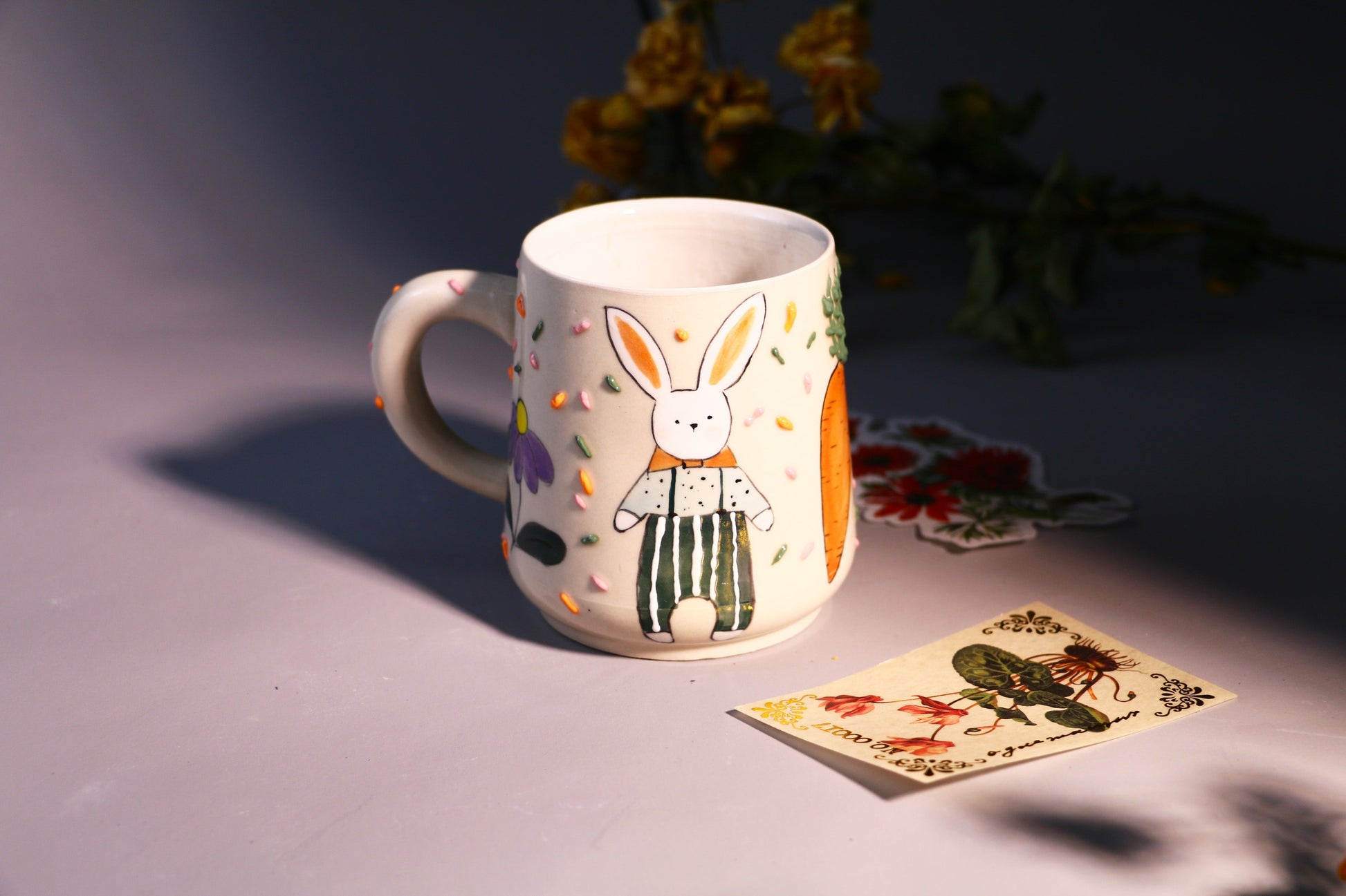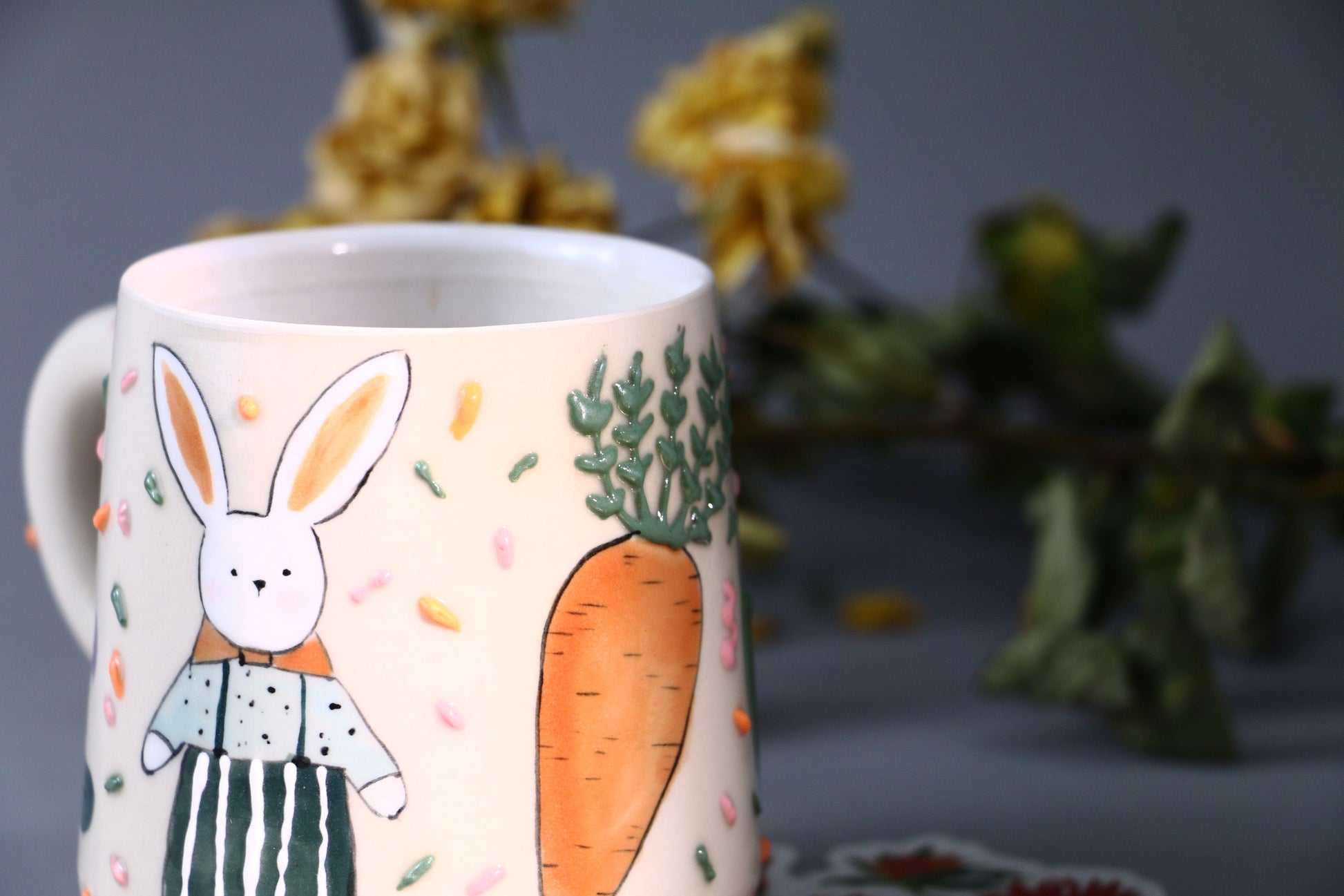 Whimsical Rabbit Ceramic Coffee Mug, Hand-painted Personalized Handmade Pottery Cup for Gift